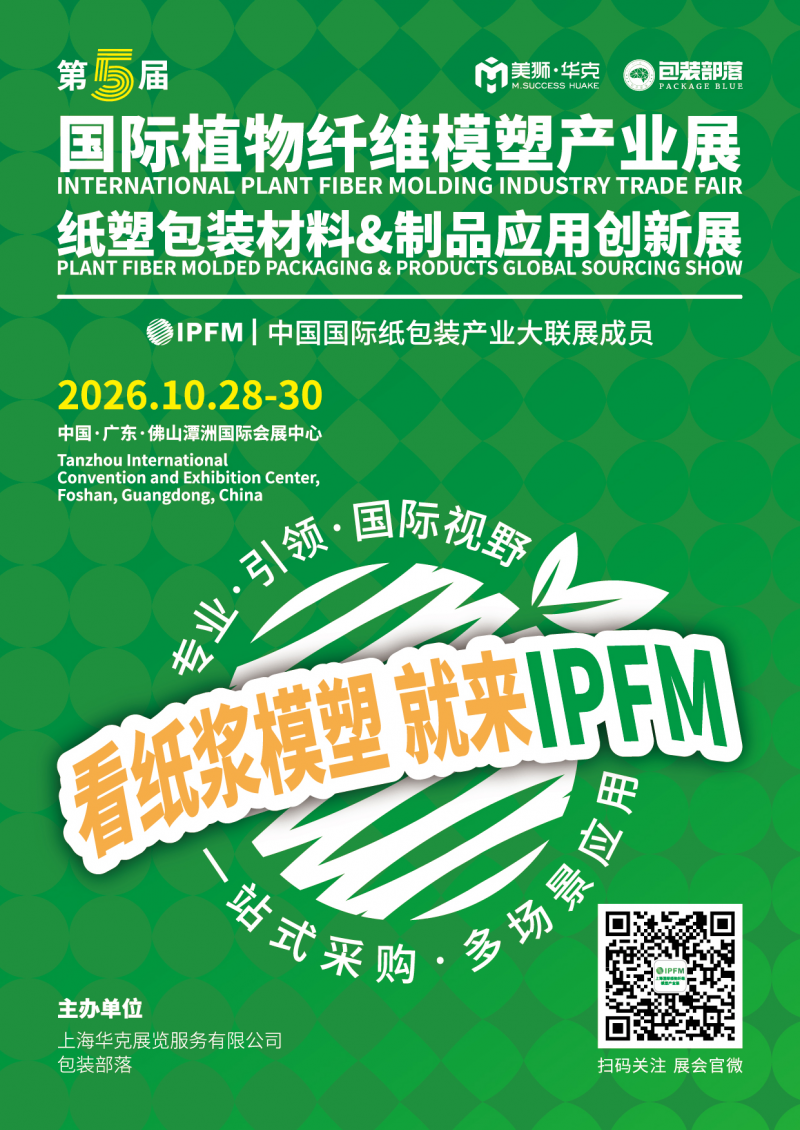 2026年10月28-30日,IPFM2026将在中国·广东·佛山潭洲国际会展中心隆重举行!迈入第五届的IPFM将汇聚行业智慧,以创新驱动新质生产力,赋能纸浆模塑产业转型升级提速,快速步入高质量健康发展阶段;同时积极开拓国际、国内消费应用端商机,彰显纸浆模塑绿色力量的无限潜力。